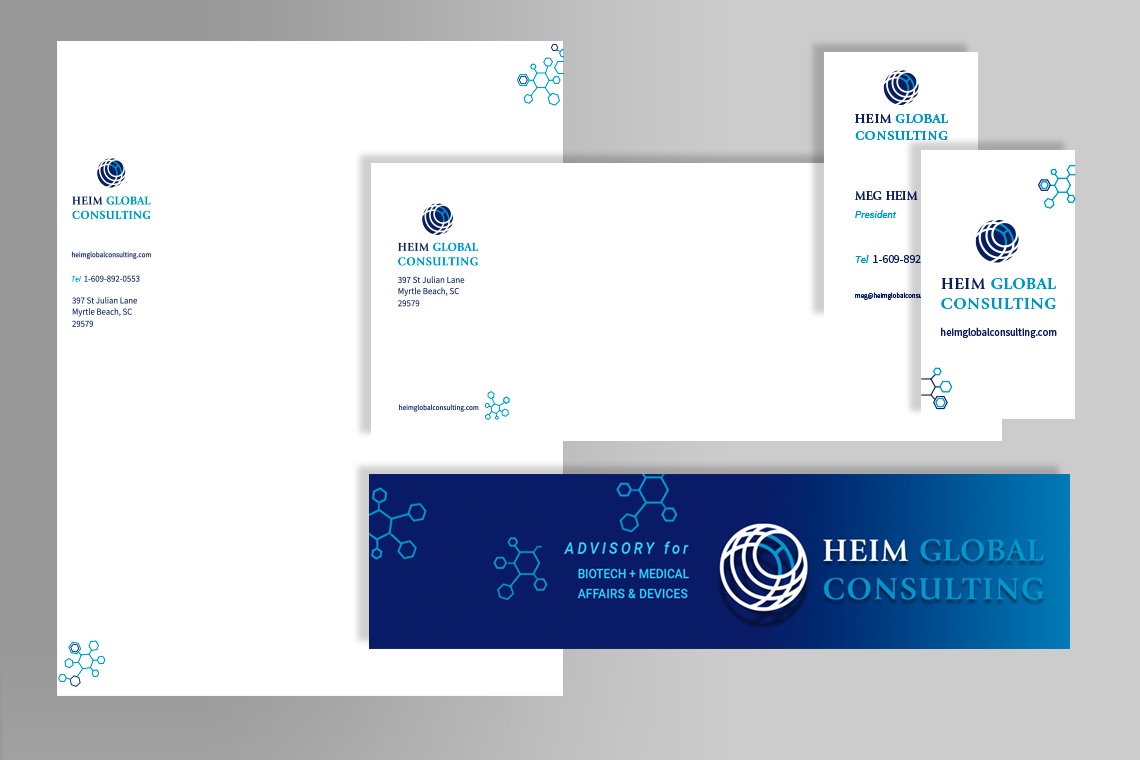 Heim Global Consulting inspired us to create a corporate identity program accentuating the founder's accomplished career in biotechnology, pharmaceutical, and biomedical fields. In time for Meg Heim's launch at the Medical Affairs Professional Society Masterclass in New York City, her global logo whirled with her initial “H” and paid tribute to her expertise and openness to collaboration and ingenuity. Accents of cellular structures and invigorating blues invite clients to enter her realm. Her corporate identity program extends from print to web, including business collateral and online digital works and content building we developed for Zoom, LinkedIn, and websites.