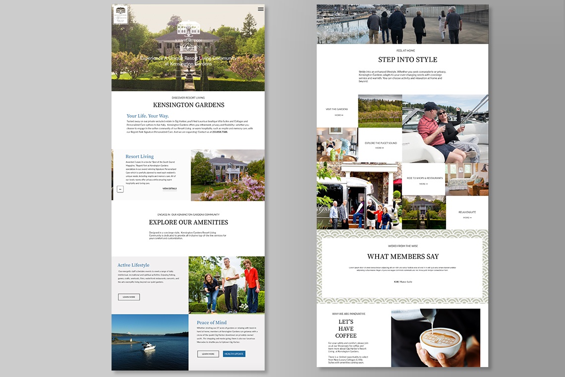 Design Centric embraced the challenge of developing a new, multi-paged website for Kensington Gardens, a 55+ resort living community. Focusing on the theme of "your life, your way," the website captured a journey through the comfort and style embedded in the beauty of its gardens and accommodations – upscale suites of their estate-like manor suites, cottages, and villas of their expansion. The new website architecture promoted consistent branding, effective storytelling, and the inclusion of original photography and drone videography, accentuating the goal for residents to live fully as they age. Close communication with Kensington Gardens' owner and manager enabled our freedom to initiate and execute content and imagery, unfolding the breadth of the resort in a user-friendly, marketable way. The website became such an effective tool for marketing that the team chose to shift advertising from print to the website.
