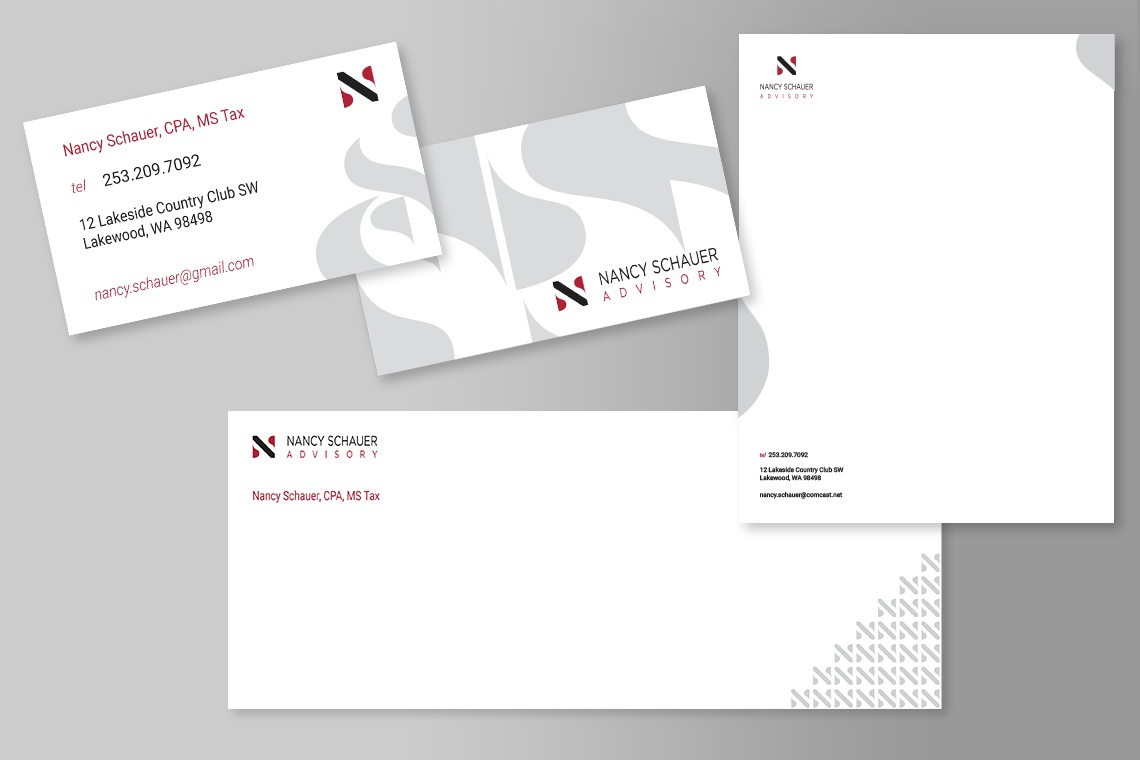 After years as a partner at a top accounting firm, Nancy Schauer inspired us to create an innovative logo for her boutique advisory firm. As with no clear-cut answers to solve complex tax issues, the logo encourages the client to see the "N" and the "S" of her namesake and the illustrative percentage sign of her mathematical solutions. Boldly, red and black play off of the coloring of profit and loss of the industry. Her contemporary corporate identity program aligned with her cutting-edge clients who followed her for ingenuity and prowess—and the ability to think outside of the box. The letterhead, business card, notecard, and label, placed on the bulk envelopes of tax returns, added a budget-friendly and competitive flair to stoic industry-wide collateral.